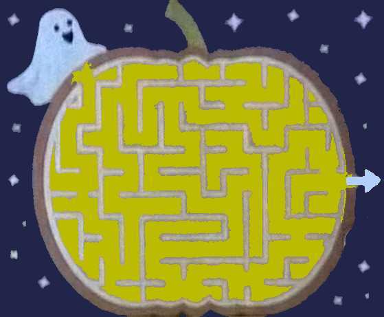 Wie kommt der Geist (auf den gelblichen Wegen zwischen den hellen Wänden) durch den Kürbis?